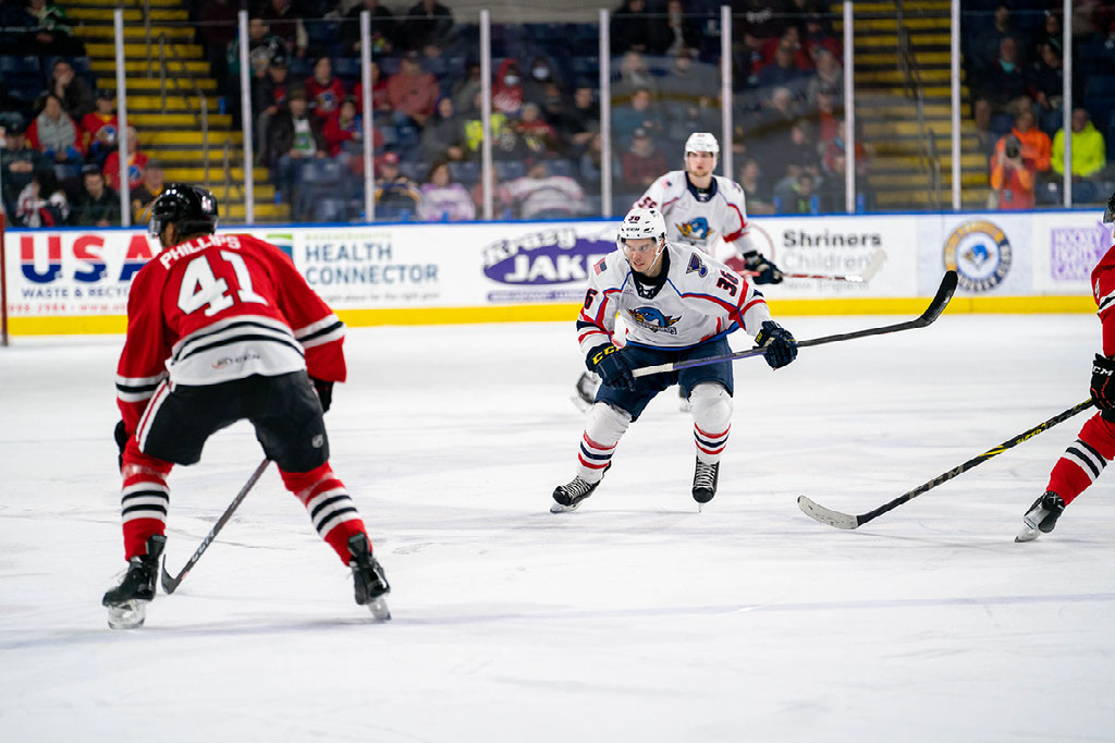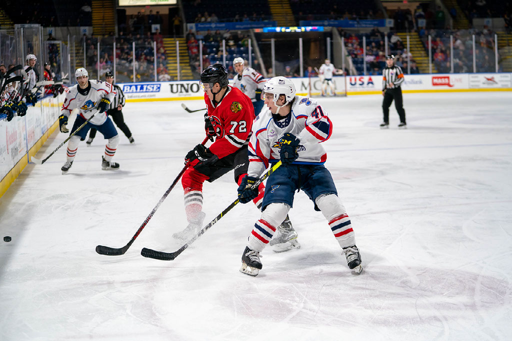 In their return to the Thunderbirds, skating on the same line, Alexey Toropchenko and Nikita Alexandrov nearly generated the game’s opening goal when they moved in on a 2-on-1 against Rockford goaltender Dylan Wells. The pair worked a nice give-and-go, but Wells sprawled with his left leg to stonewall Toropchenko from the right circle, keeping the game scoreless.