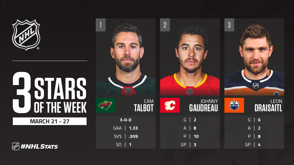 NEW YORK – Minnesota Wild goaltender Cam Talbot, Calgary Flames left wing Johnny Gaudreau and Edmonton Oilers center Leon Draisaitl have been named the NHL’s “Three Stars” for the week ending March 27.