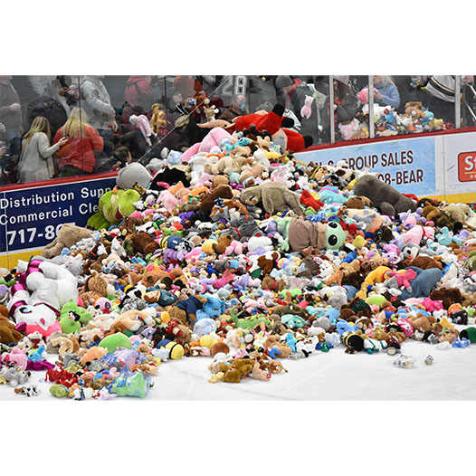 A busy night in Hershey on January 22, 2022. The Hershey Bears took on the Hartford Wolfpack and when Hershey scored, a storm of 52,341 stuff bears and toys showered onto the ice. It was “Teddy Bear Night” in Hershey. The excitement continued with the Bears beating the Wolfpack by a score or 5-0 with the help of a hat trick by Alex Jonsson-Fjallby