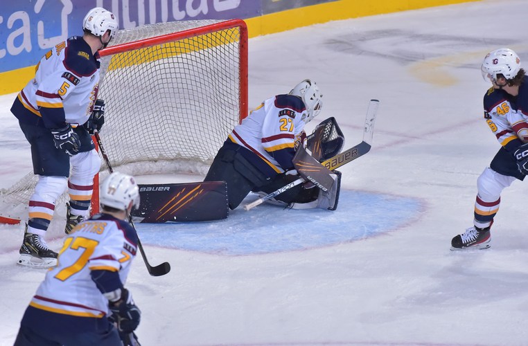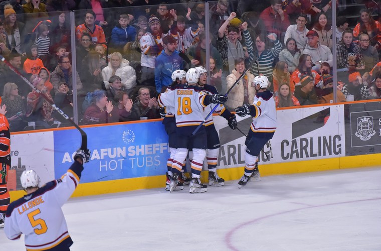 Logan Fredericks’ inch-perfect shot into the top of Greenfield’s net put the Flames two ahead 3:34 into the second period, but thereafter the Steelers went up a gear. The hosts hit both the post and the crossbar before eventually finding a way past Eamon McAdam on a broken play through Robert Dowd’s backhanded shot in at the near post. Momentum was with the hosts, and then tied the game at 38:03 through Scott Allen to leave things all square going into period three.