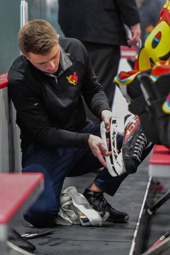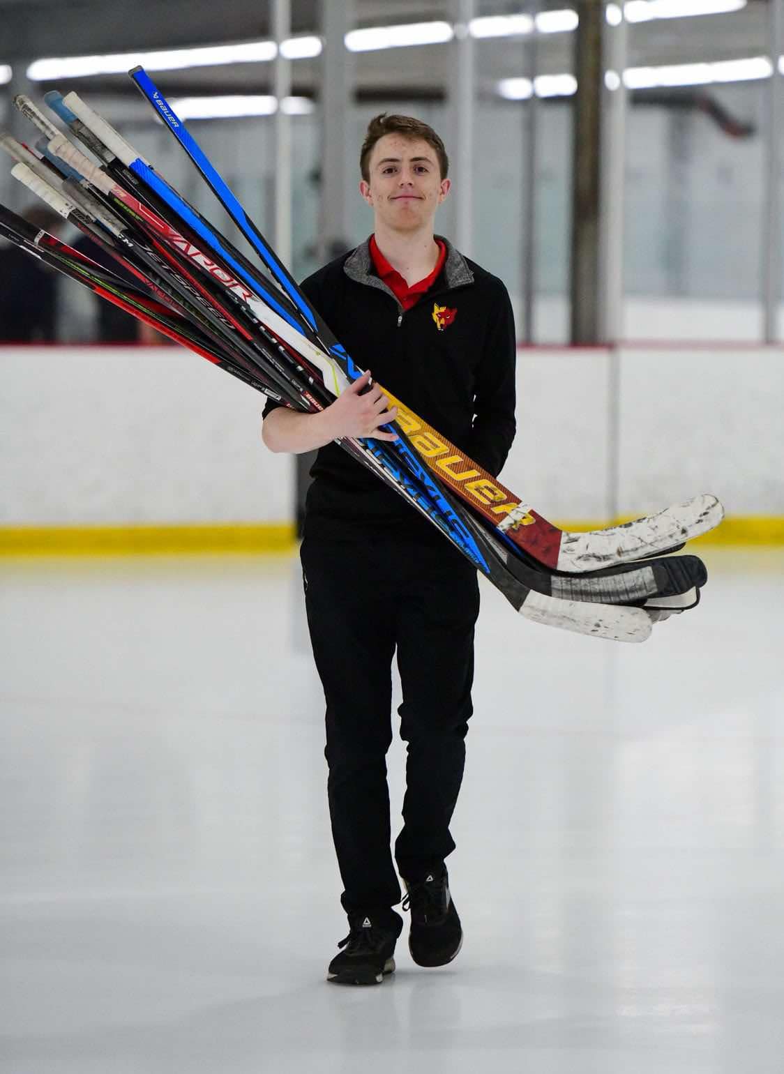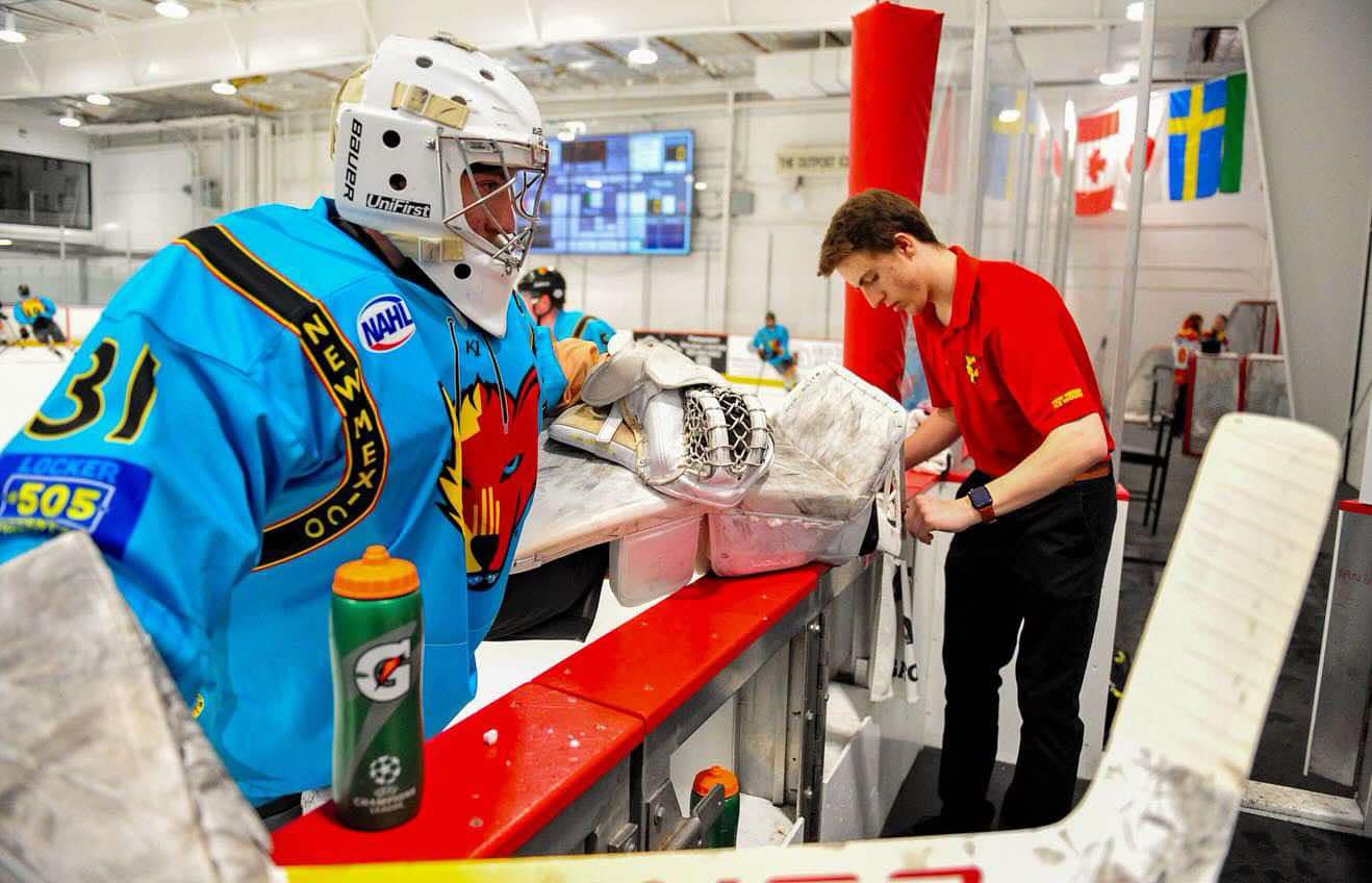 James’ mother Kara Fichtner says his career started out at a community service project, “When he was 14, he needed community service hours for National Honor Society. Hockey was a big part of his world, and the Ice Wolves were a new team. They had an equipment manager who knew James from around the rink. James asked him if he could volunteer his time to help to get his community service hours. He helped on game days, getting the locker room ready with jerseys, socks, tape, filling the water bottles, getting the backup sticks to the bench, game pucks, doing the laundry after the game and learning new skills related to supporting a hockey team. Before the first half of the season was over, the equipment manager left. They still needed help on game days so he continued to help.” Kara said, “They didn’t hire anyone to fill that position for year 2 so James helped. He enjoyed being a part of the team and getting to know the players. Year 3, ironically, they hired his Dad, who had just retired, as the equipment manager to do laundry, sharpen skates and be at the home games. James taught his dad what was needed to fulfill that job and continued to help during game days. Year 4, James took a break and focused on his senior year of high school Last season, they needed an equipment manager to cover both teams, and James accepted the job offered to him.”