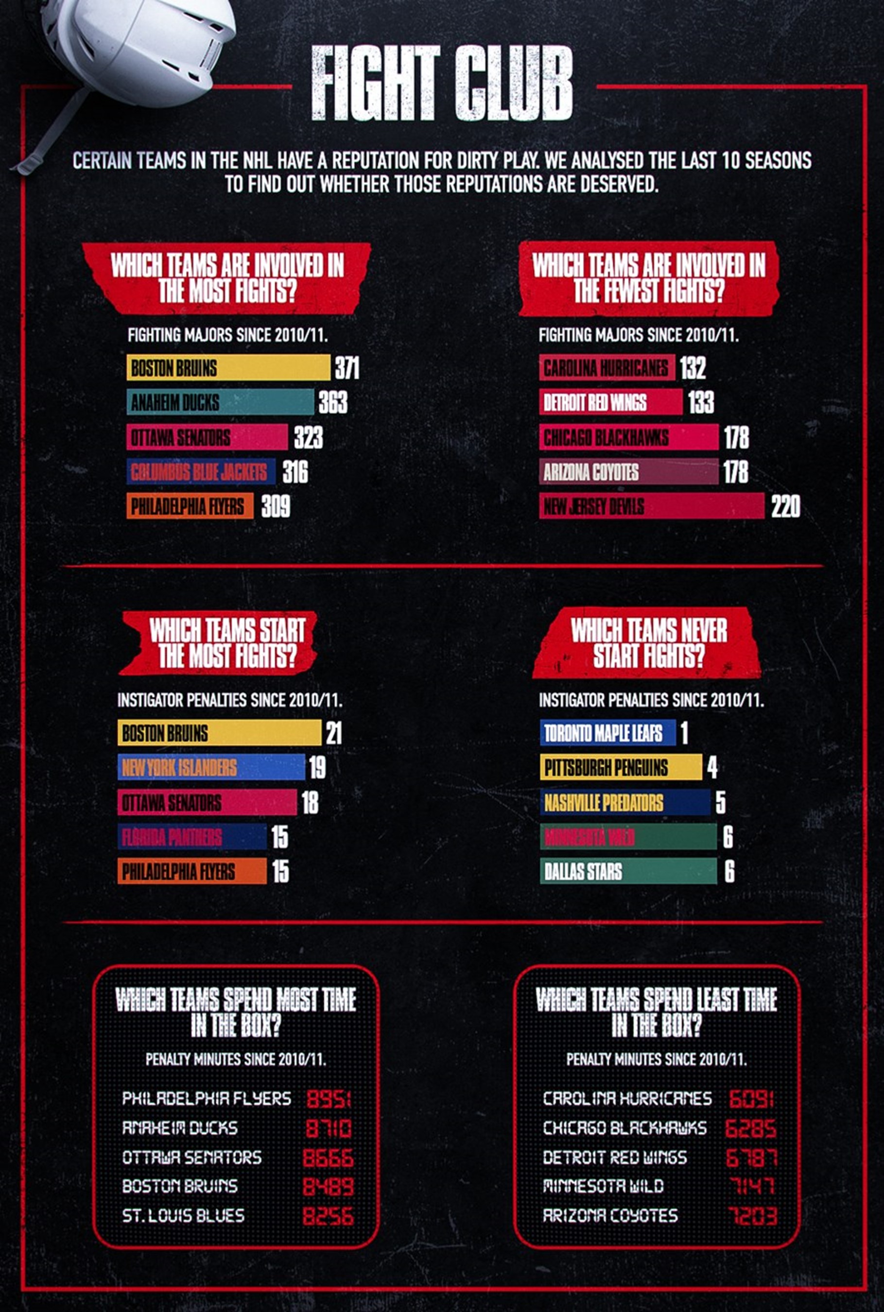 Research from Betway actually shows that since 2010/11 the Boston Bruins have been involved in the most fights (371).