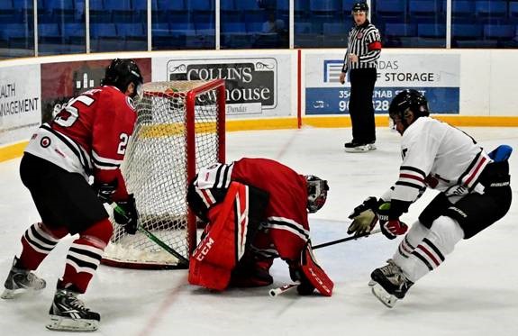 Dundas defenceman Al Rourke digs for the puck in the skates of goalkeeper Mike Mole, while Brantford’s Jordan Owens tried a new dance-step in last Friday’s Allan Cup Hockey match. Brantford won 8-5 in the JL Grightmire Arena.