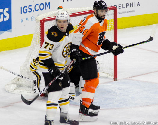 Charlie McAvoy #73 of the Boston Bruins and Nate Thompson #44 of the Philadelphia Flyers