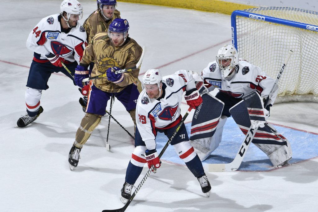 Once the crowd settled back in after the fight, they saw Windsor and Thompson continue their individual battle that was leaving both sides wondering how to find the back of the net. The pair traded sterling saves with Thompson’s highlight coming with two stops on Solar Bears forward Chris LeBlanc in quick succession and a stop from the seat of his pants on Tristin Langan while Windsor showed off both his catching glove and blocker to send Cole Ully and Tim Harrison away empty handed.