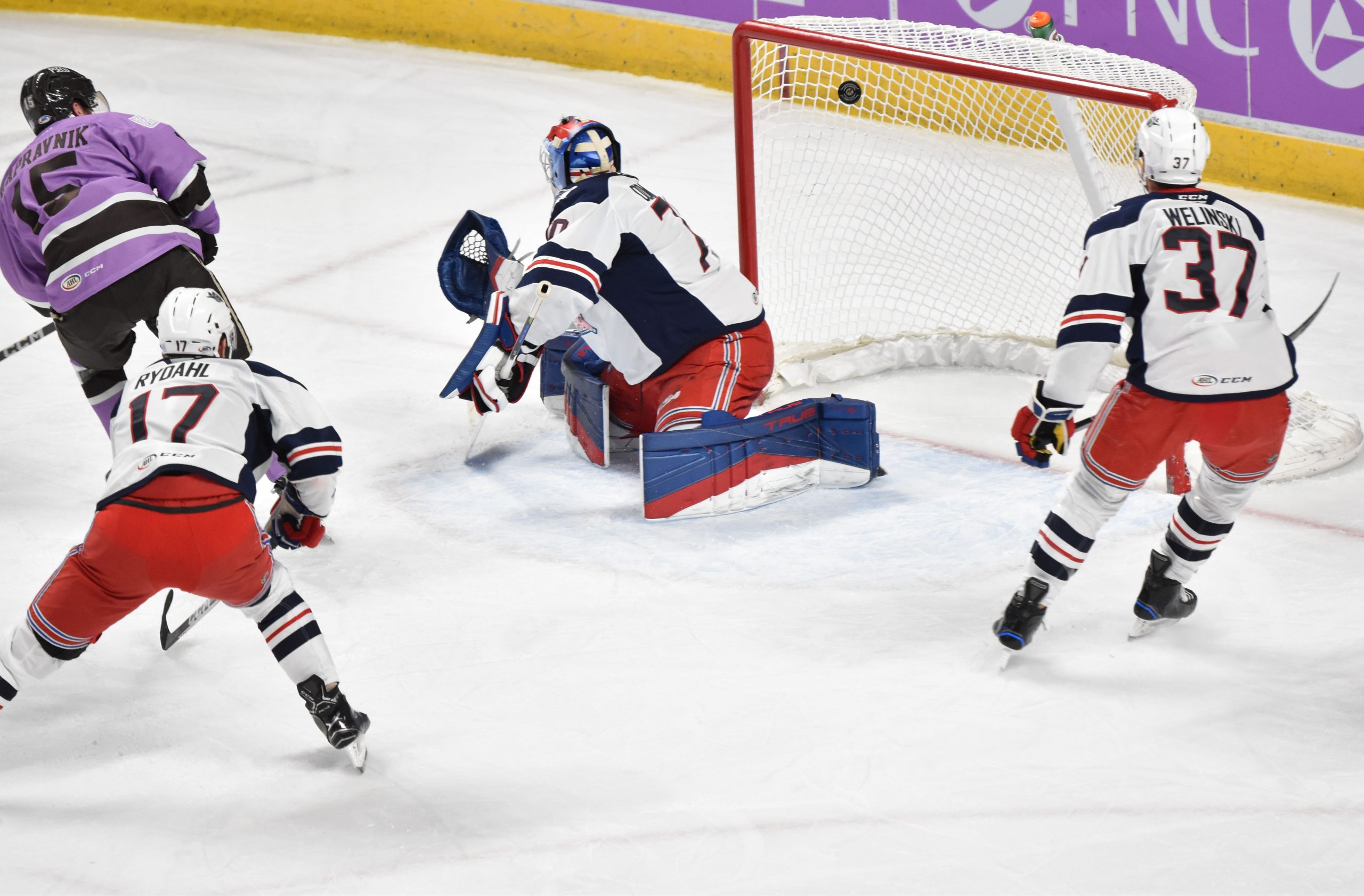 Ty Emberson put the Wolf Pack ahead for good 5:58 into the second period when he scored his first goal with the club. Karl Henriksson took a pass to the left of netminder Zach Fucale and darted behind the Hershey goal. As he popped out on the right side, Henriksson fired a pass back to the point for Emberson, who blasted home the goal that would stand as the eventual winner.
