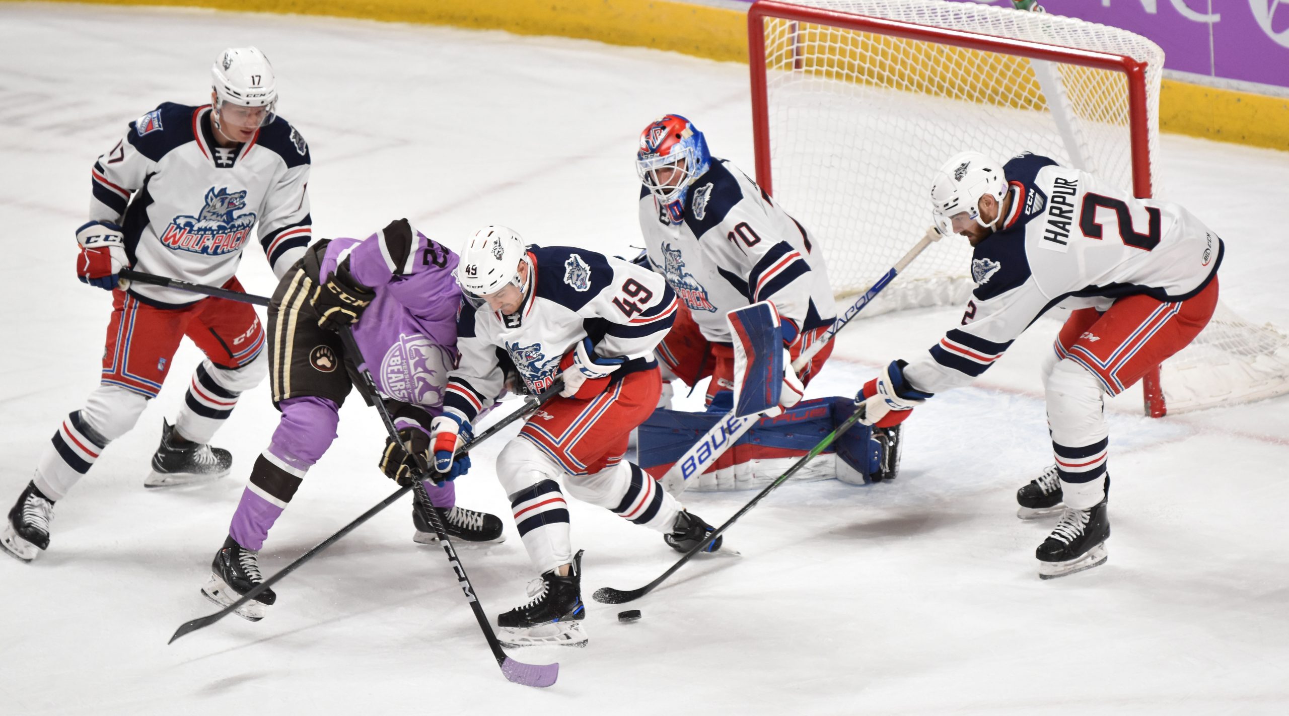 The Wolf Pack tied the game 2-2 just 51 seconds into the middle frame, as Ben Harpur pounced on a loose puck for his second goal of the season. Gettinger made a power move to the goal but was initially denied by Fucale. Harpur followed the play and found the rebound, flipping it over Fucale for the club’s second shorthanded goal of the year.