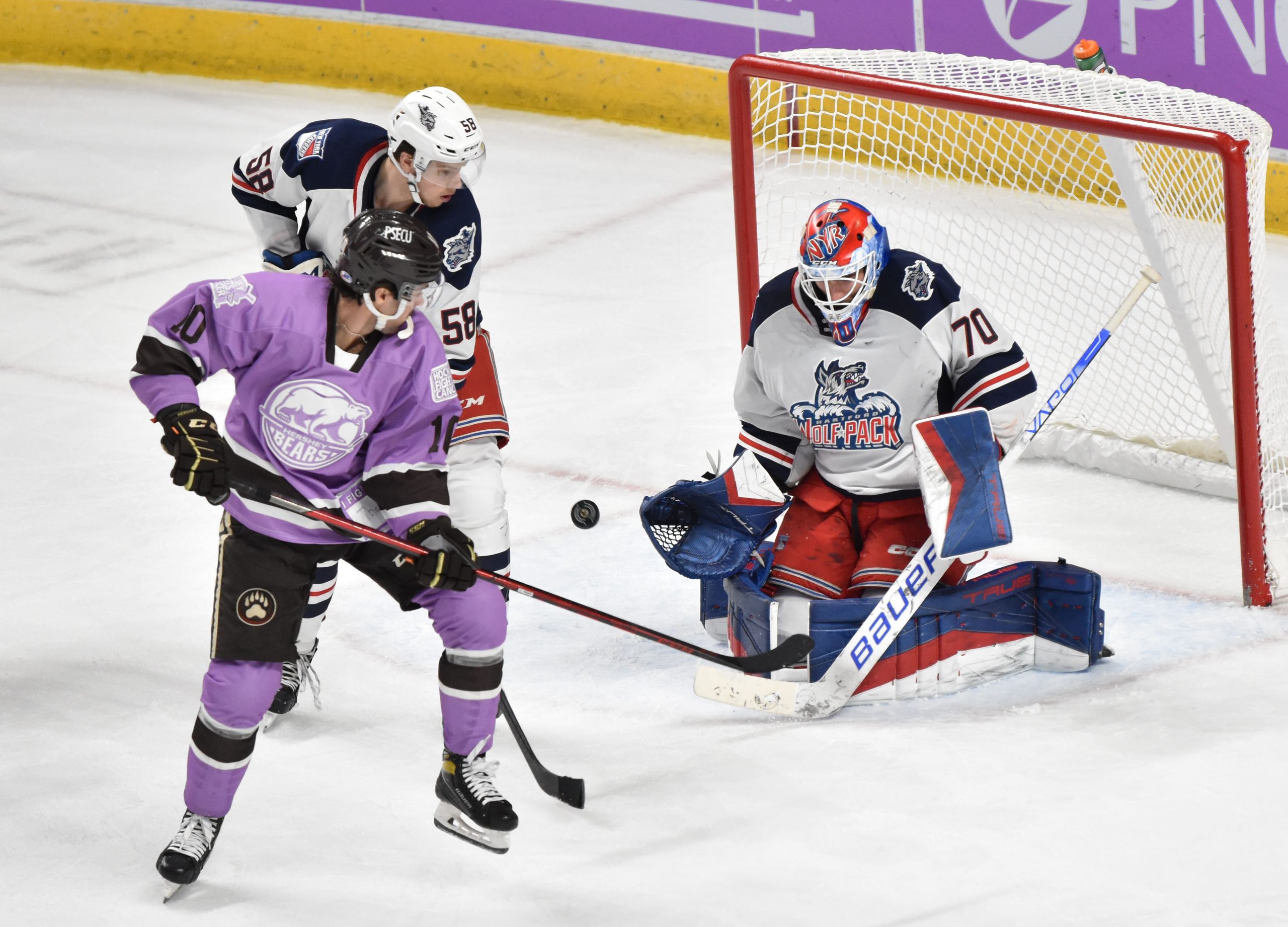 Ty Emberson put the Wolf Pack ahead for good 5:58 into the second period when he scored his first goal with the club. Karl Henriksson took a pass to the left of netminder Zach Fucale and darted behind the Hershey goal. As he popped out on the right side, Henriksson fired a pass back to the point for Emberson, who blasted home the goal that would stand as the eventual winner.