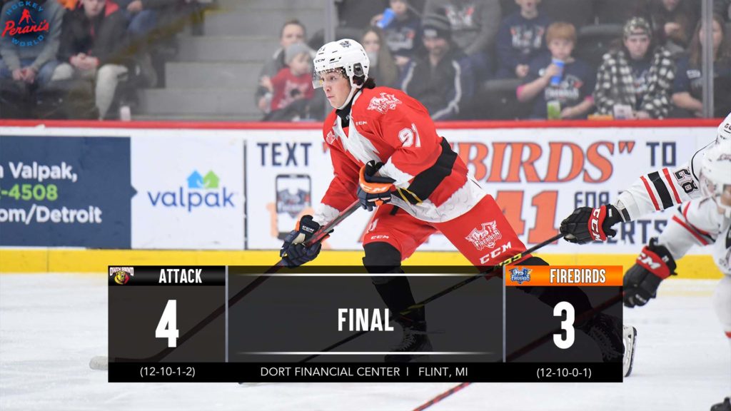 Flint, Mich. – The Firebirds hosted the Owen Sound Attack Saturday in game two of a back-to-back weekend series. Flint scored three straight goals before allowing two late and falling by a 4-3 final score. Zacharie Giroux was named the game’s ‘First Star’ after scoring once and picking up two assists for the three-point night. Brennan Othmann (New York Rangers) and Riley Piercey also lit the lamp, and defenseman Tyler Deline added two assists to his impressive stats from the blue line. Ethan Burroughs led the Attack with a goal and an assist. Between the pipes, Ian Michelone made 23 saves on 27 shots across from Nick Chenard, who stopped 26 of 29 for his sixth victory of the season.