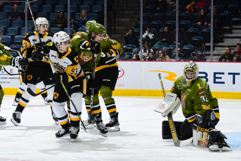 The final frame kicked off and the troops killed off the remaining 10-seconds of their penalty, but then quickly went back to the box for a tripping call. 20 seconds after Hamilton’s third powerplay started, Jorian Donovan earned a tripping call of his own and it became 4-on-4 with neither team hitting the scoreboard on the abbreviated man advantages. After Ty Nelson received his second minor penalty of the night due to an after-whistle scrum, the Bulldogs had quite a few chances including Ryan Humphrey getting an in tight opportunity to which Charlie Robertson made a contender for save of the year, diving across his crease and capturing the puck to deny the Bulldogs what appeared a certain tying goal. With the Battalion power-play their high-octane offense made no mistake as Liam Arnsby cleaned up a rebound for his third of the season, and second point of the evening giving the Troops a 3-1 lead. Matvey Petrov and Dalyn Wakely added two empty net goals for the visitors and the game ended by a score of 5-1 for North Bay with Robertson making 35 saves on 36 Bulldogs shots earning the win.
