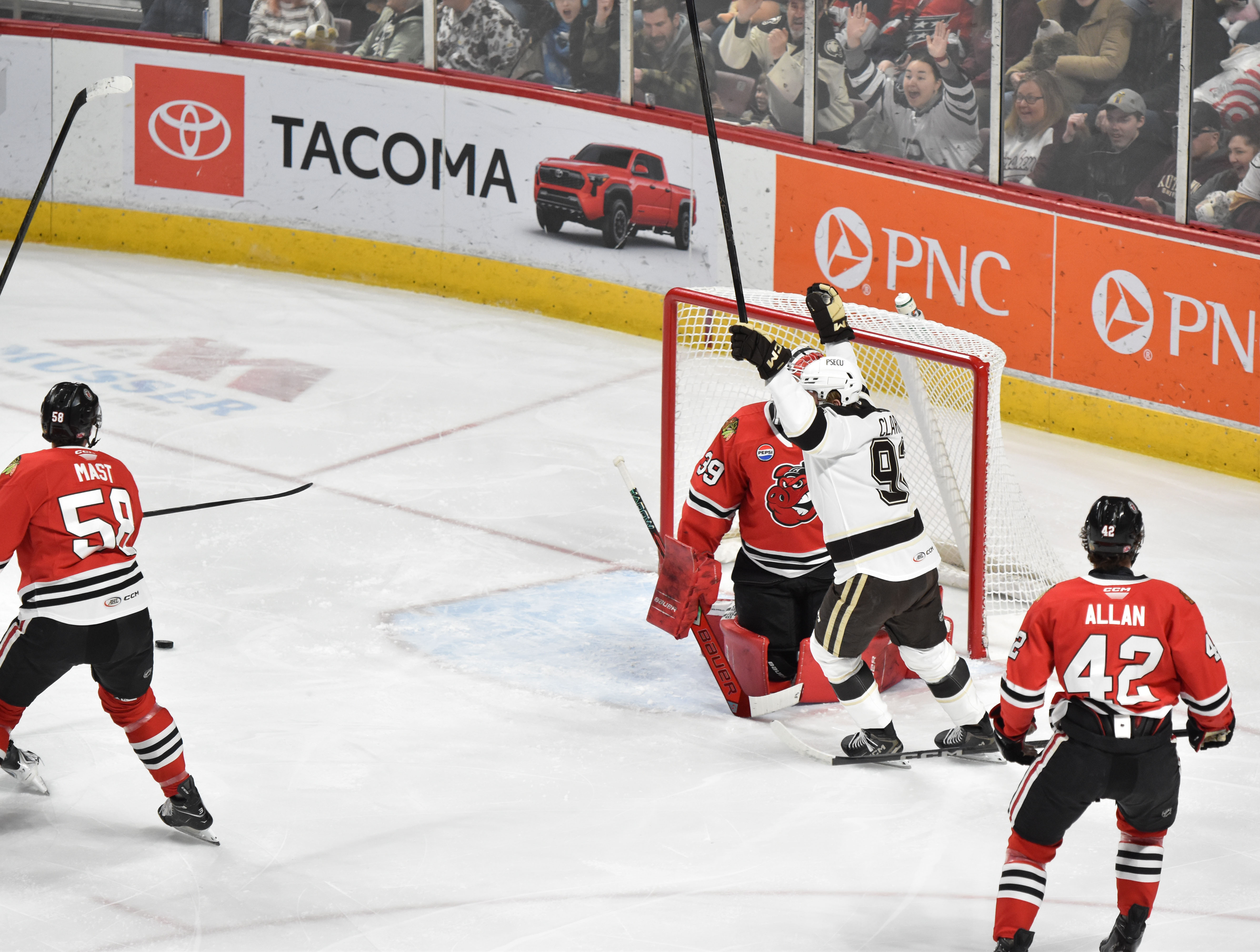 Hershey ripped the lead back and jumped in front 3-2 with two quick goals from Graeme Clarke. The winger scored first on the power play and followed up his first marker with an even-strength goal 40 seconds later.