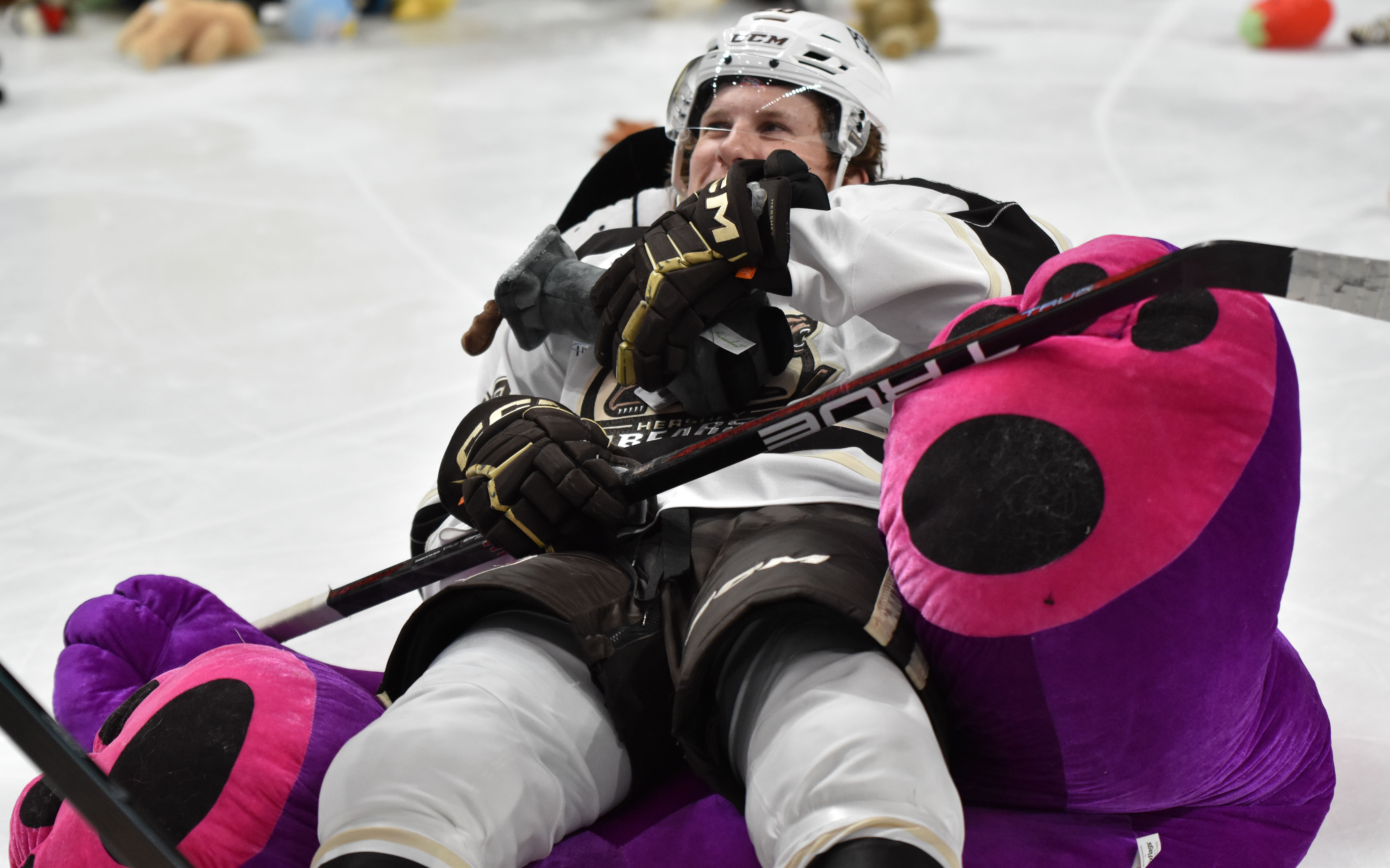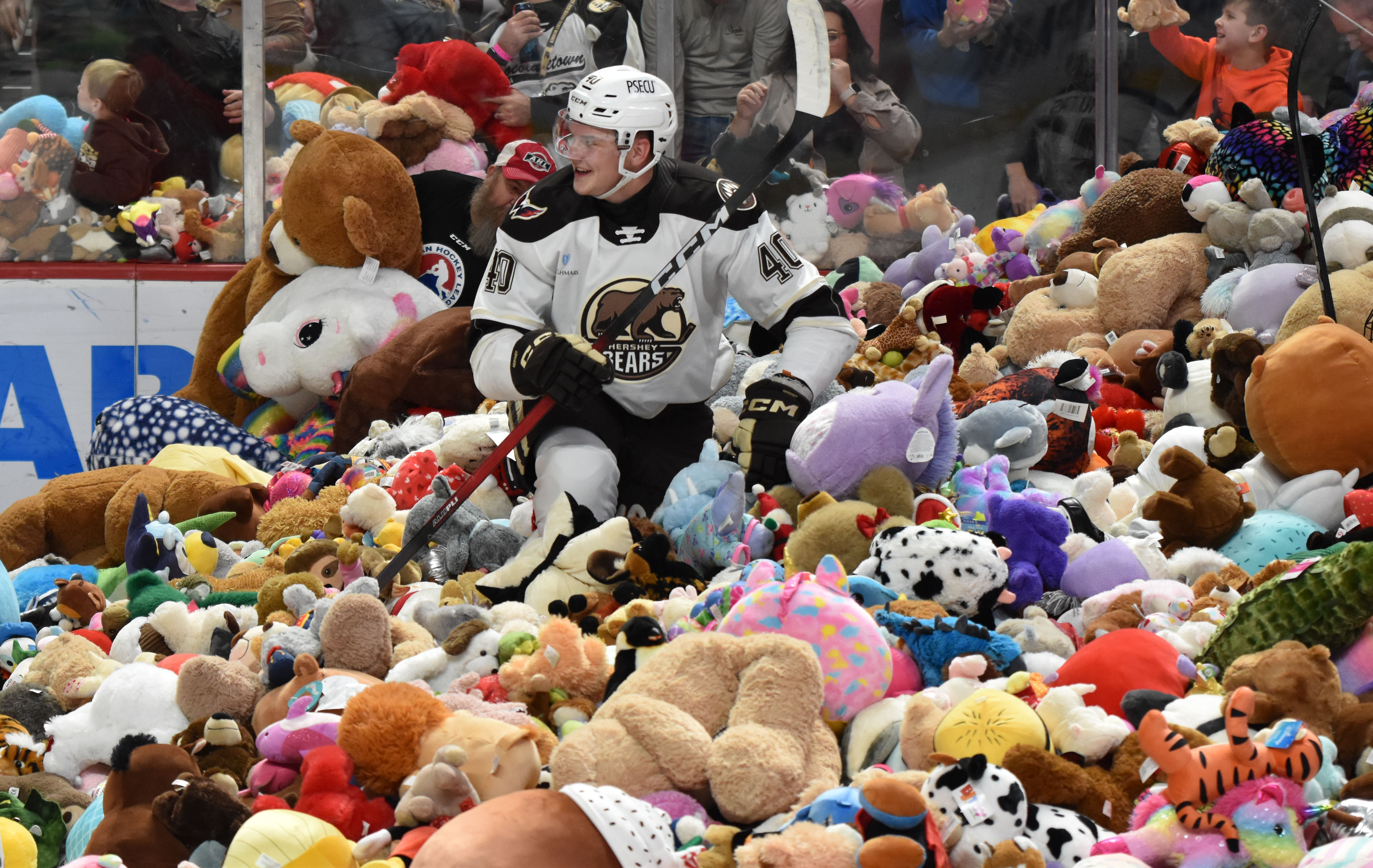The famous Hershey Teddy Bear Toss kicked off just 2:55 into the game, when Hershey defenseman Louie Belpedio scored from the right point. After a 51 minute delay for the cleanup and resurfacing, the teams returned to the ice for the remainder of the 1st.