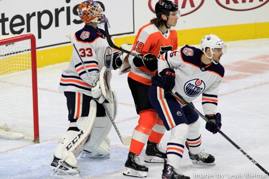 Edmonton Oilers Goalie Cam Talbot (#33), Center Nolan Patrick (#19) of the Philadelphia Flyers and Defenseman Kevin Gravel (#5) of the Edmonton Oilers