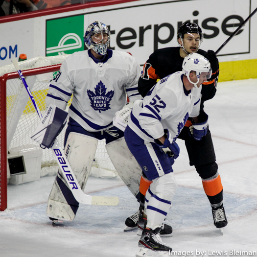 Martin Marincin #52 of the Toronto Maple Leafs and Carsen Twarynski #81 of the Philadelphia Flyers battle for position in front of Toronto Maple Leafs Goalie Frederik Andersen #31