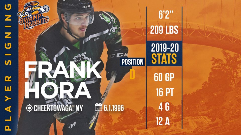 GREENVILLE, SC — The Greenville Swamp Rabbits have agreed to terms with defenseman Frank Hora on a standard player contract for the upcoming 2020–21 season. Hora, 24, spent last season with the Cincinnati Cyclones, and will enter his fourth professional season.