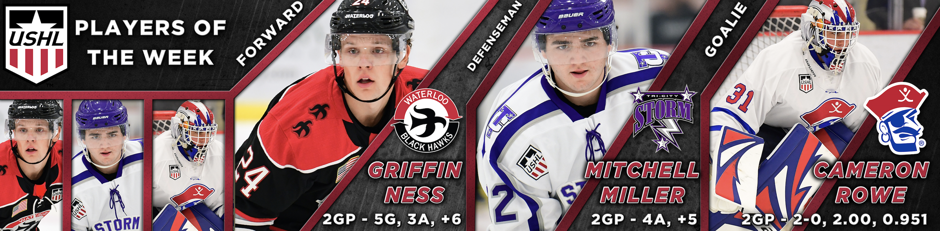 CHICAGO, ILL. – The United States Hockey League (USHL) announced Wednesday the Forward, Defenseman and Goaltender of the Week for Week 18 of the 2019-20 season. This week features the second weekly honor in-a-row for Tri-City Storm blueliner Mitchell Miller while Des Moines Buccaneers goaltender Cameron Rowe and Waterloo Black Hawks forward Griffin Ness each collected his their first career weekly awards. The USHL is America’s only Tier I junior hockey league and continues to lead the world in the advancement of Division I college hockey athletes.
