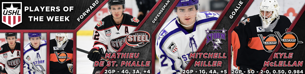USHL leading scorer, Chicago Steel forward Mathieu De St. Phalle, earned his first career Forward of the Week award while Tri-City Storm defenseman Mitchell Miller and Omaha Lancers goaltender Kyle McLellan were each awarded their third weekly honors of the season. The USHL is America’s only Tier I junior hockey league and continues to lead the world in the advancement of Division I college hockey athletes.