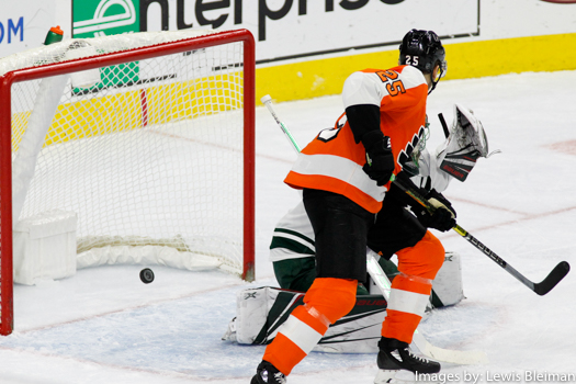 Left Wing James van Riemsdyk (#25) of the Philadelphia Flyers redirects the puck past Goalie Devan Dubnyk (#40) of the Minnesota Wild