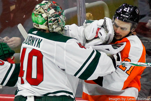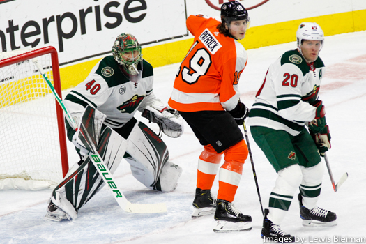 Goalie Devan Dubnyk (#40) of the Minnesota Wild, Center Nolan Patrick (#19) of the Philadelphia Flyers, Defenseman Ryan Suter (#20) of the Minnesota Wild
