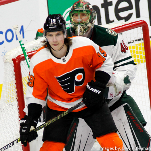 Center Nolan Patrick (#19) of the Philadelphia Flyers screens Goalie Devan Dubnyk (#40) of the Minnesota Wild