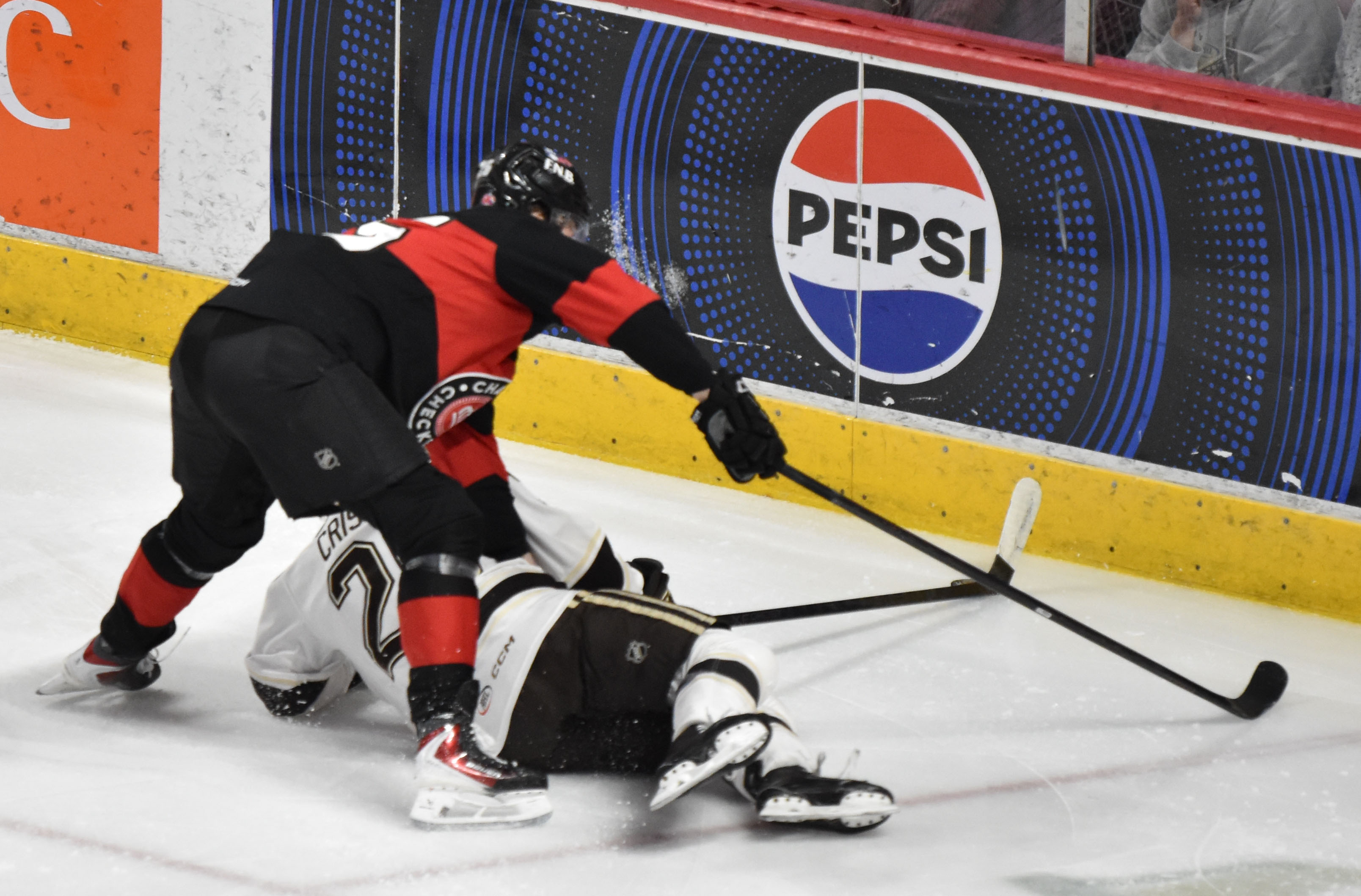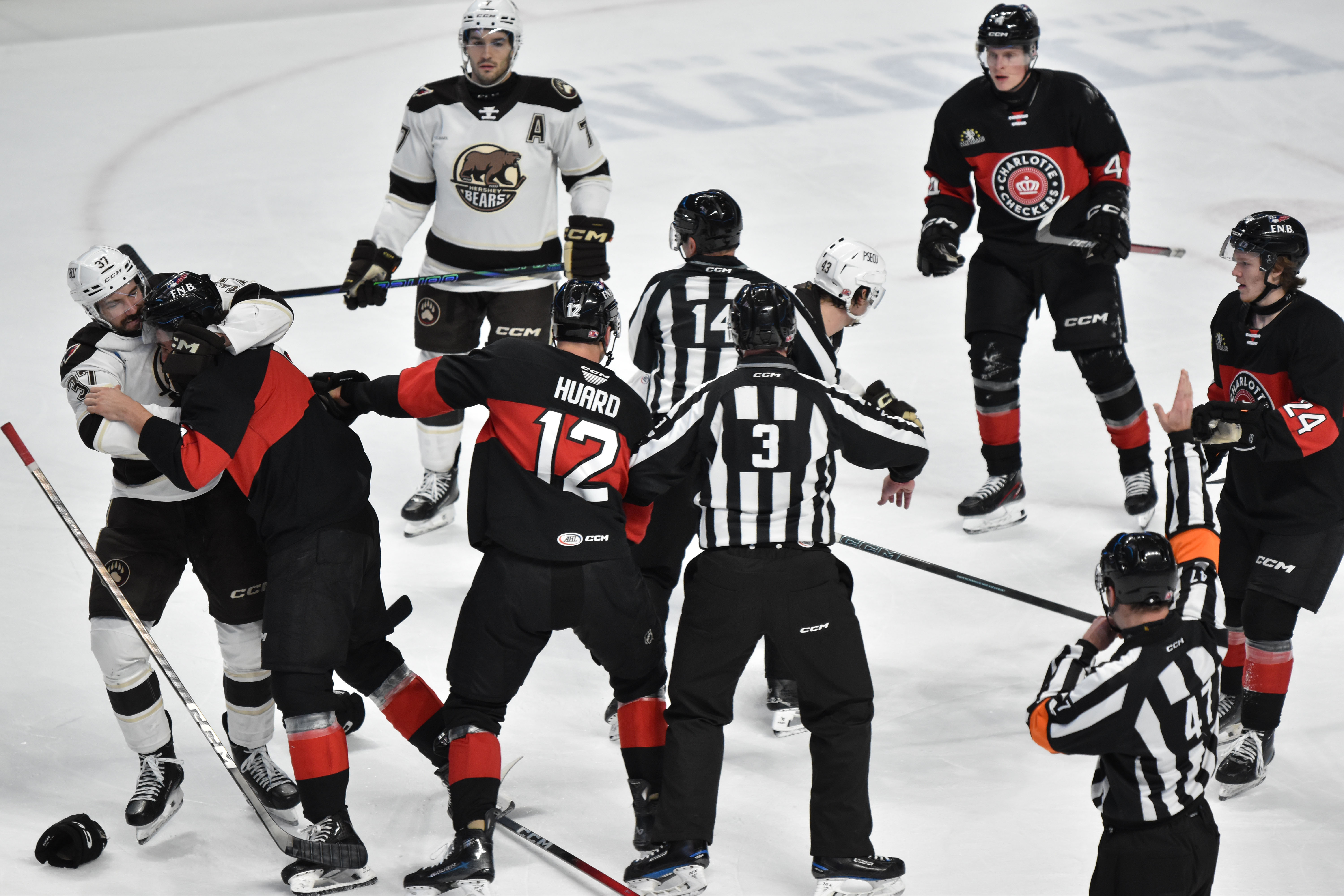 The Bears came out with a ferocious push in the third period, scoring two power-play goals 1:49 apart. Former Checker Spencer Smallman and Louie Belpedio lit the lamp for Hershey, tying the game.