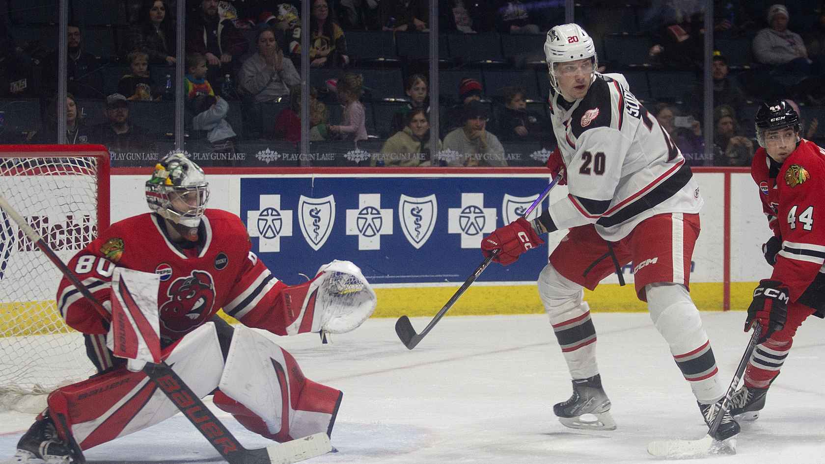 Trailing 1-0 late in the third period, the Griffins pulled Cossa in favor of the extra skater (18:21). Brett Seney stole the puck at center ice and Albert Johansson was charged for hooking from behind, Seney was awarded the empty-net goal to seal the IceHogs’ 2-0 win.