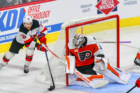 Conner Brown #16 of the New Jersey Devils tries to pass the puck in front of the net guarded by Dan Vladar #80 of the Philadelphia Flyers Photo Credit – Jack.Smart@prohockeynews.com