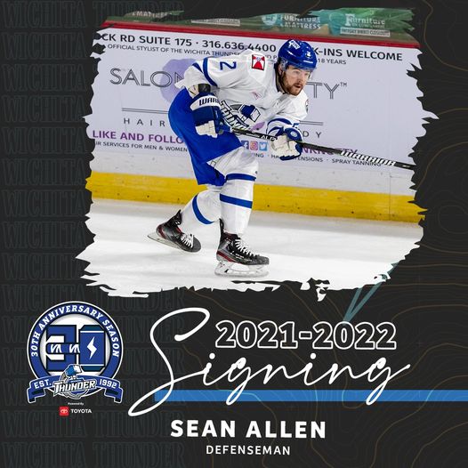 WICHITA, KS – The Wichita Thunder, ECHL affiliate of the National Hockey League’s Edmonton Oilers and American Hockey League’s Bakersfield Condors, announced today the re-signing of defenseman Sean Allen for the 2021-22 season.
