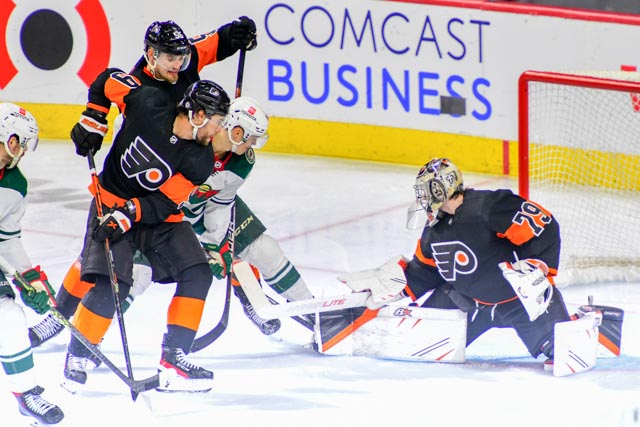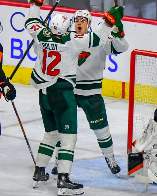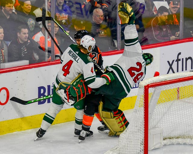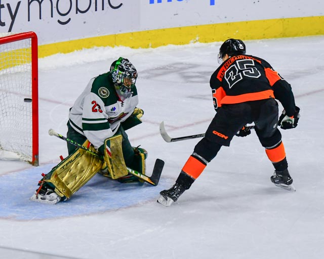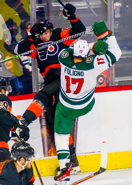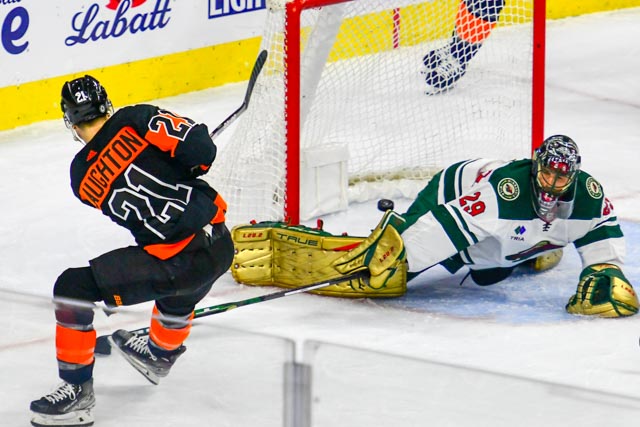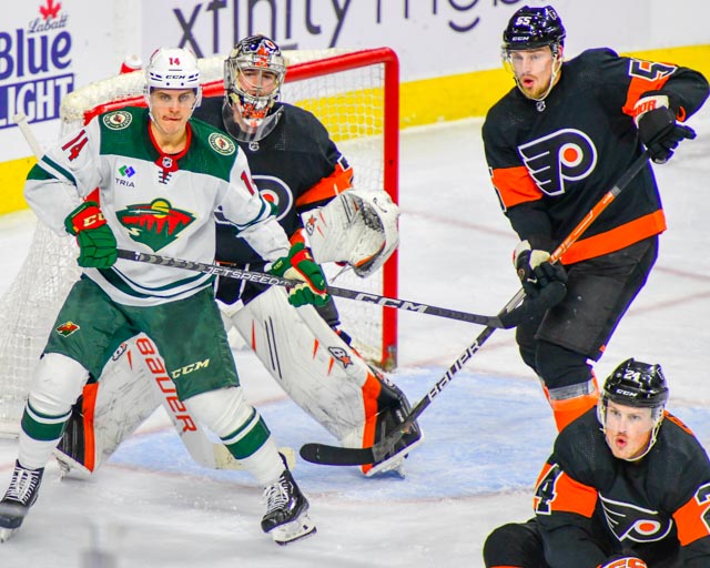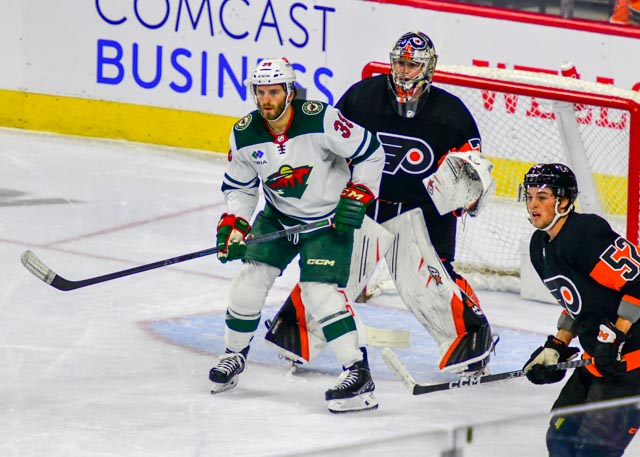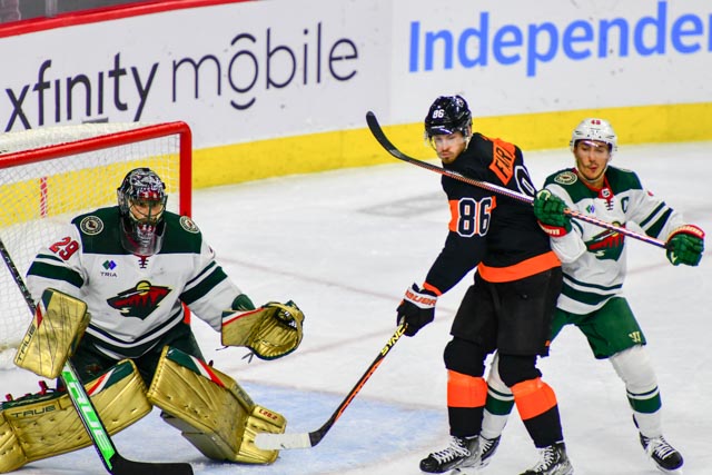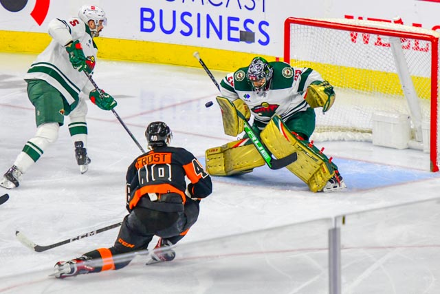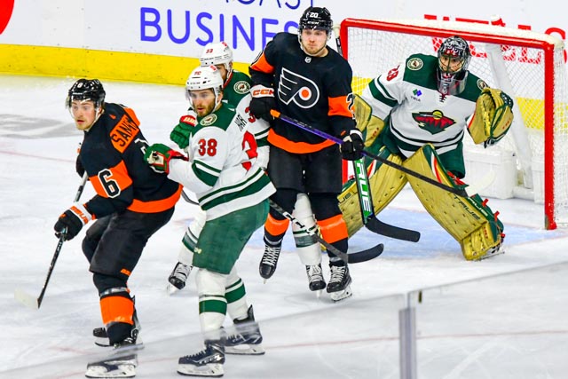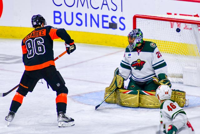 The Flyers’ Scott Laughton, and the Wild’s Oskar Sundqvist exchanged first period goals for a 1-1 tie headed to the third.
