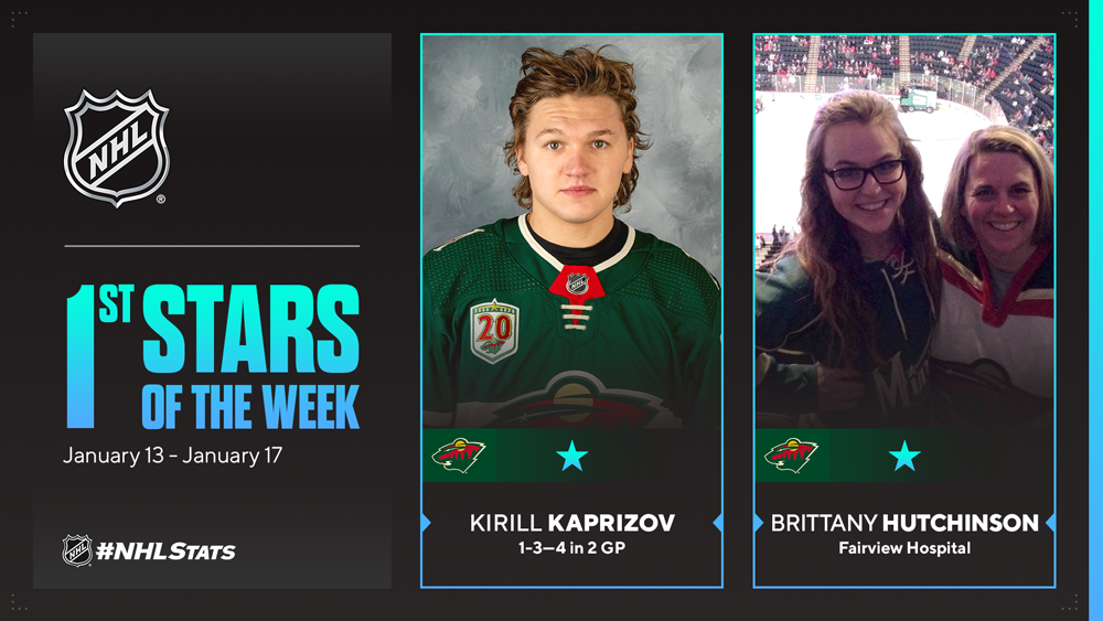 NEW YORK – Minnesota Wild left wing Kirill Kaprizov and Fairview Hospital RN Brittany Hutchinson have been named the NHL’s “First Stars” for the week ending Jan. 17.