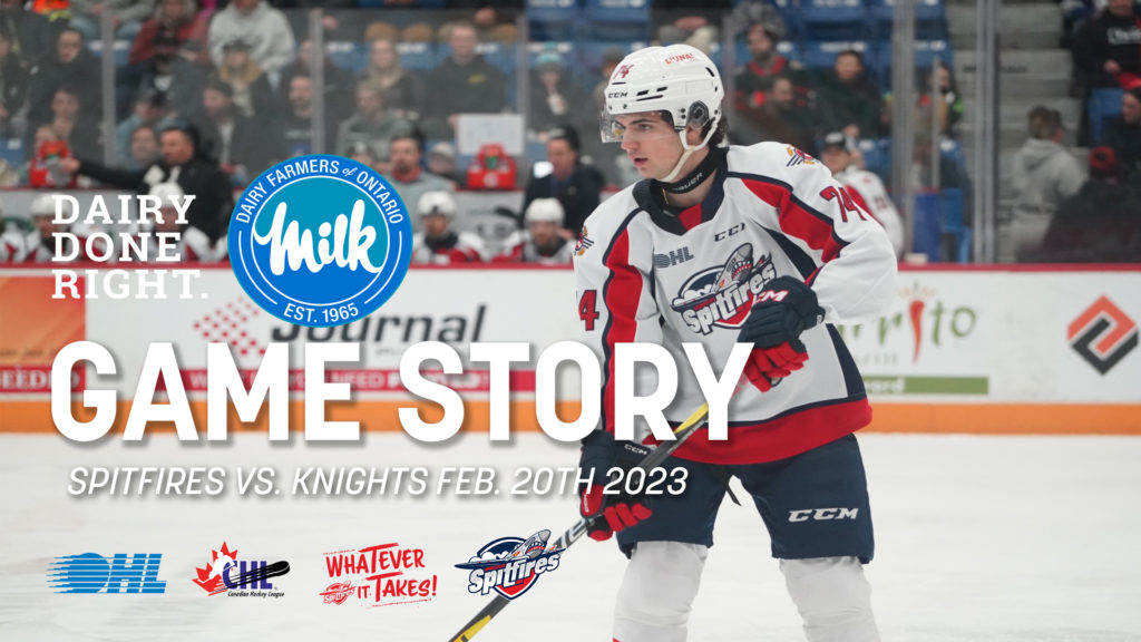 In the first period, it was the Knights scoring first, just under three minutes in. Just four minutes later, the Spitfires would respond. Abraham got the puck on the side boards and he sent it down low to Harrison who passed it in front to Christopoulos and he would score his 38th of the season. The Spitfires would have a 12-10 shot lead after the period.