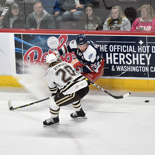 In the middle frame, Hartford again struck first to jump ahead 2-1. Jonny Brodzinski, assigned to the Wolf Pack from the Rangers taxi squad on Sunday morning, extended his point streak to five games with his team-leading 12th goal. Zac Jones carried the puck behind the Hershey goal, then placed a perfect pass onto the stick of Brodzinski at the front of the goal. The captain fired the puck over the blocker of Fucale at 5:36 of the second period.