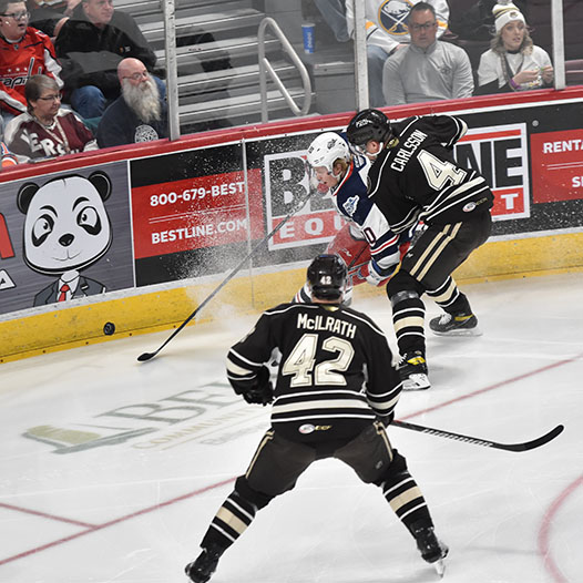 A loose puck at the blueline got away from the Wolf Pack on their first powerplay of the night, creating a footrace through the neutral zone between Matthew Robertson and Henrik Rybinski. Rybinski won the footrace, then entered the Wolf Pack zone on a breakaway. He snapped a shot by Dylan Garand for his third goal of the season 15:08 into the tilt, ballooning the Hershey lead to 2-0. The goal was the third shorthanded marker of the season for the Bears and proved to be the game-winner.