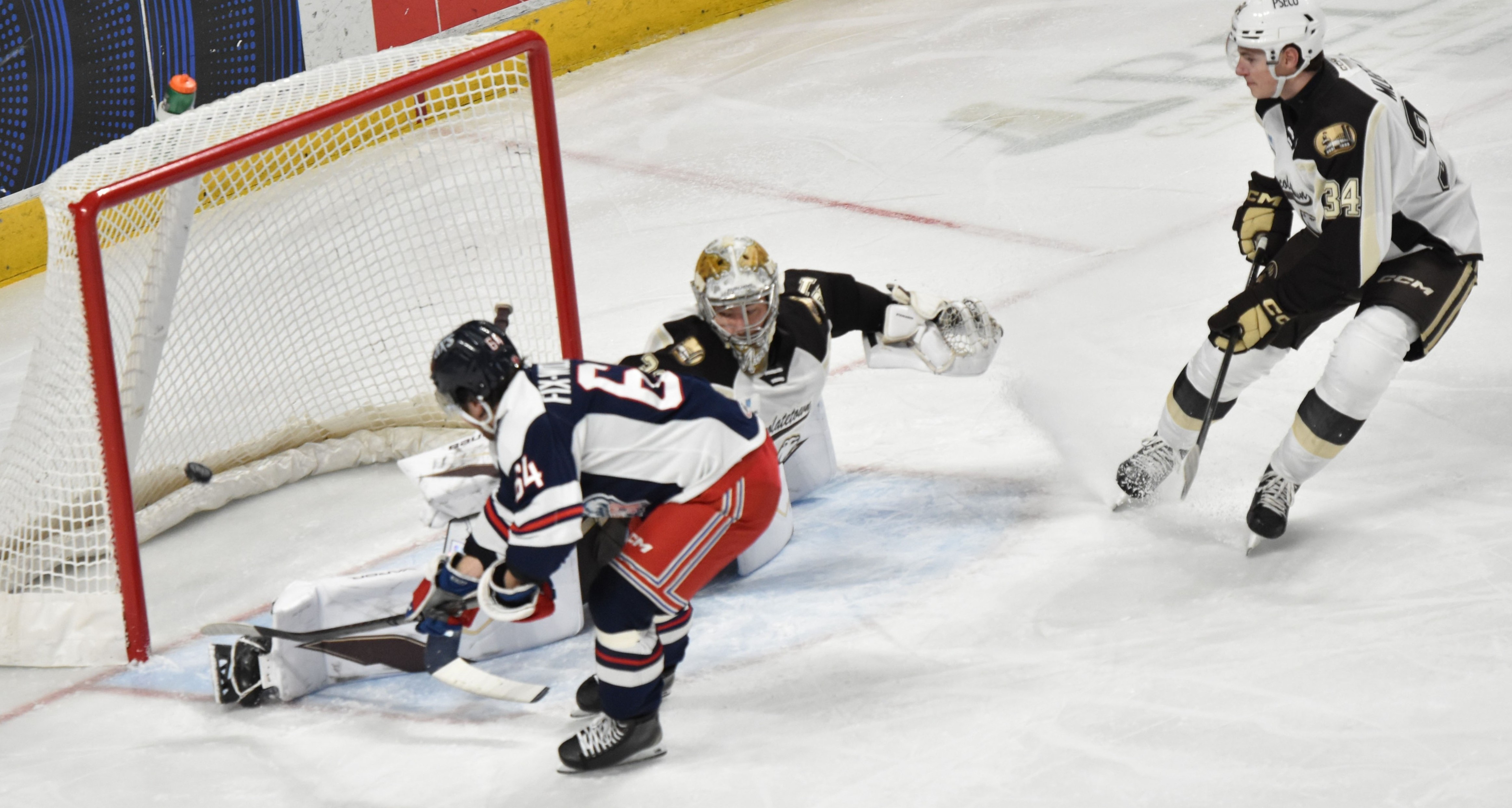 Ilya Protas’ 15th goal of the season at 2:51 made it a 4-3 contest. He fired a long shot that snuck through Garand and just barely crossed over the line. After a review, the call on the ice was confirmed a goal.