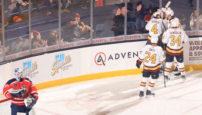 The Wolves kept coming and took a three-goal advantage a short time later. Suzuki wheeled into the Milwaukee zone and wired a shot from the left dot that sailed by Chrona’s glove and into the net. Suzuki upped his season goals total to three on the score assisted by Austin Wagner and Charles Alexis-Legault.