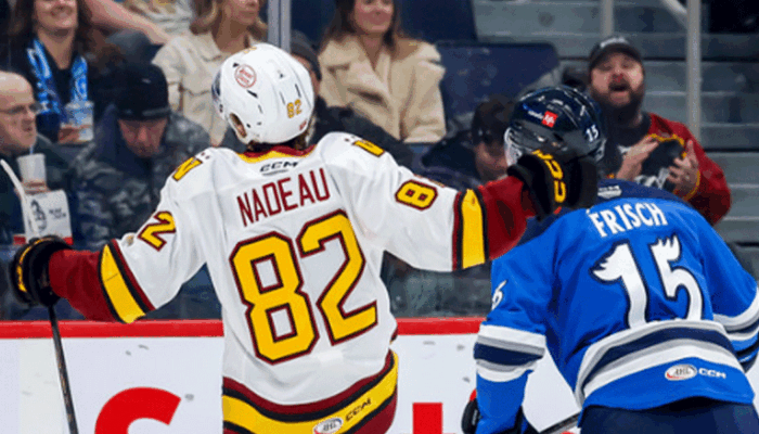 Late in the opening period, the Wolves were skating on the power play when Nadeau gathered a cross-ice pass from Unger Sorum and ripped a shot from the left dot that sailed over the right shoulder of Manitoba netminder Domenic DiVincentiis. Unger Sorum and Domenick Fensore picked up assists on the score.