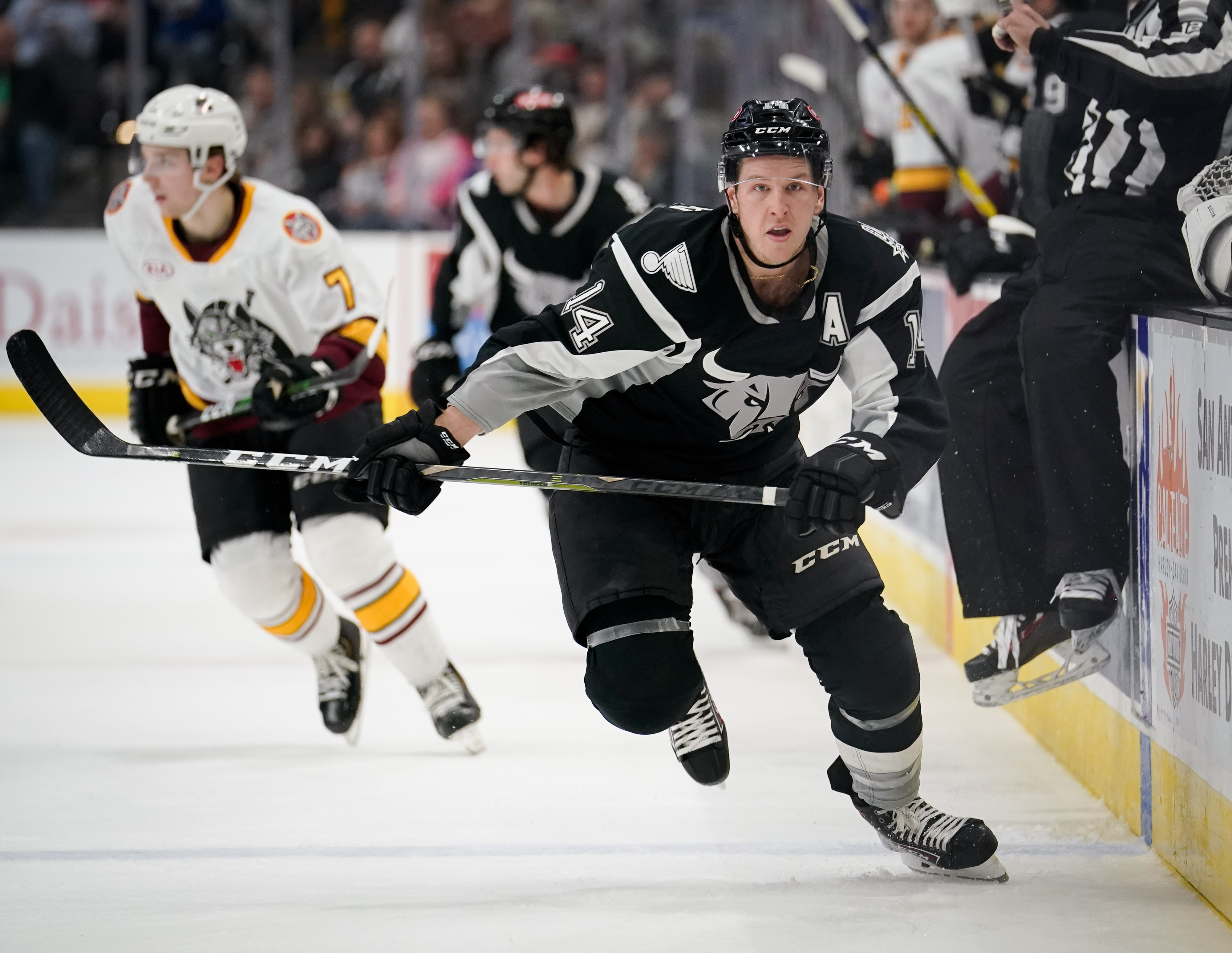 Pirri delivered his ninth goal of the year to give the Wolves a 4-1 lead at 9:38 of the second. Pirri tried to fire on Husso from close range, but his stick snapped. He sprinted to the bench, received a new stick from Wolves equipment manager Ryan Shoufer, rushed back to the high slot and accepted a Brown pass that he hammered home.