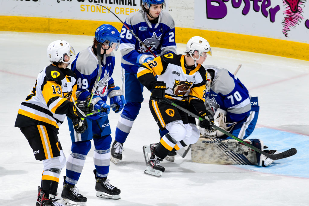 HAMILTON, ONTARIO. Mitchell Weeks made himself the story of the opening period, stealing what looked like a sure goal from the stick of Brenden Anderson off a cross crease feed from Mason McTavish, an explosive post to post glove save was the difference. Not deterred the Bulldogs kept the pressure on the Sudbury end and managed to crack the Wall of Weeks. At 10:09 George Diaco brought the puck over the line, moving it left for a racing Lawson Sherk who in turn fed Gavin White skating through the middle, touching the puck past Weeks for his 8th goal of the season. Matteo Drobac meanwhile stopped all four he faced in the first frame assuring the Bulldogs 1-0 into the first intermission.